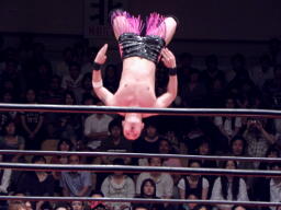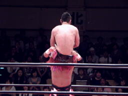 岸和田コーナーに振って2発目のコーナースプラッシュ狙う、HIROKIかわしてボディスラム狙うが上がらない(右写真)。