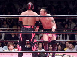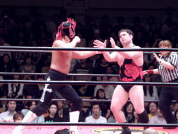 HIROKIラリアット(右写真)、相打ちからHIROKIもう一発ラリアット、カウント2。