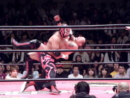 HIROKIマハラジャ狙うが上げられず。逆に岸和田垂直落下式ブレーンバスター(左写真)。5分経過。