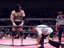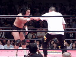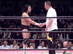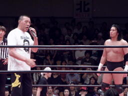 ここまで2勝2敗。もし2勝2敗1分けになった場合は両チームから代表者を出して決勝戦、というルールであったがグレート小鹿は時間切れ引き分けになるのを嫌い「時間無制限一本勝負、リングアウトなしの完全決着」を宣言(右写真)、GENTAROもこれに応じ大将戦は時間無制限で行われることに。68歳で時間無制限て!