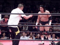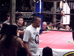 GENTAROはボディにエルボー連打、小鹿はコーナーにへたり込む。小鹿軍団は口々にGENTAROを罵る(左写真)。しかしアントンが「老人をいじめるな!」と言うとバラモン兄弟「老人って言うな!」