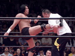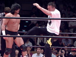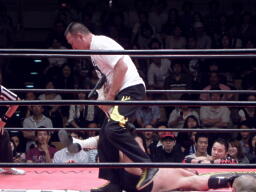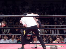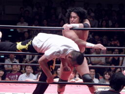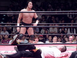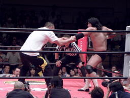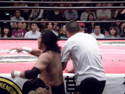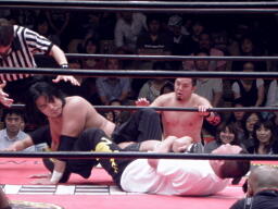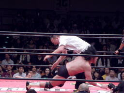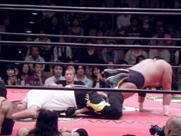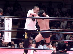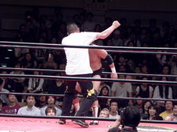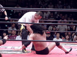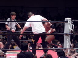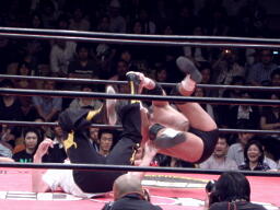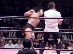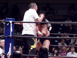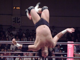 GENTAROロープに飛び乗ってラ・ケブラーダ(左写真)、しかし小鹿はかわし小笠原を直撃。5分経過。