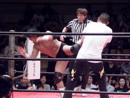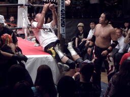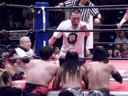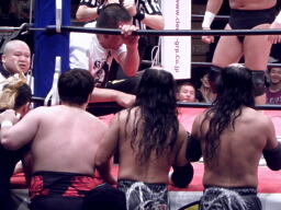 GENTAROは小鹿の両足を場外に引っ張り出して鉄柱4の字(右写真)、小鹿軍団が総出でカット、GENTAROをリングに戻す。10分経過。