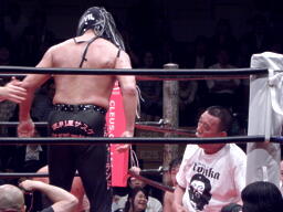 GENTAROは足を痛めセコンドの肩を借りて退場するサスケに敬礼(左写真)。