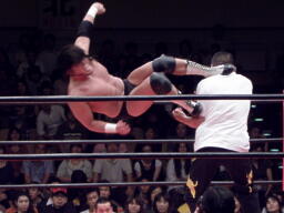ダイビングエルボードロップは小鹿かわす(右写真)。