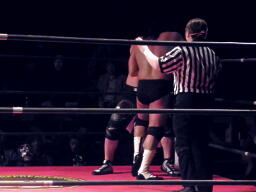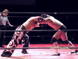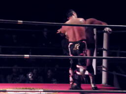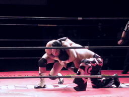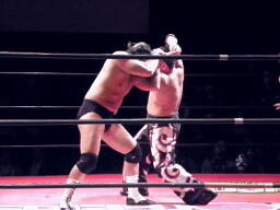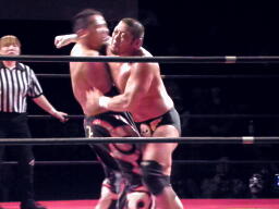 ロックアップ(左写真)、佐々木が押す、GENTARO押し返す。GENTAROコーナーに押し込んでブレーク。