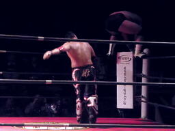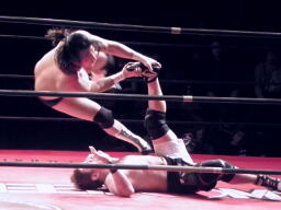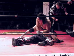 トルネードボムで叩きつける(右写真)。佐々木右腕、GENTAROかわしトルネードスープレックス、竹田がカット。佐々木右腕、GENTAROかわすが2発目がヒット。