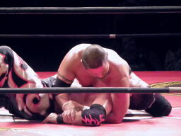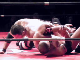 GENTAROシャープシューター狙う、竹田はアキレス腱固めに切り返す(右写真)、GENTAROクロスヒールで返す、竹田ヒールホールド、GENTAROロープ。竹田は佐々木にタッチ。