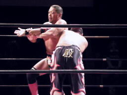 エルボーの打ち合い、張り手の打ち合い(左写真)。GENTAROタックルで倒し東郷にタッチ。
