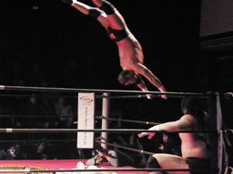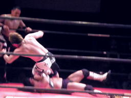 GENTARO対角線コーナーに振って串刺しエルボー。ボディスラムからコーナーに上ってローリングセントーン(右写真)。東郷にタッチ。
