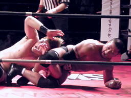 東郷サミング、首投げからスリーパー(左写真)、竹田切り返す。竹田ヘッドロックに、東郷切り返す。東郷ニーリフト、GENTAROにタッチ。