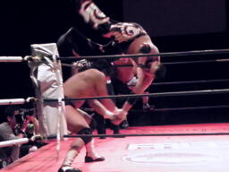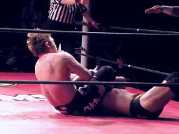 GENTARO佐々木をコーナーに上げてコーナー上でアームロック、雪崩式ブレーンバスター狙うが佐々木はマットに降りてGENTAROの尻にチョップ(左写真)。