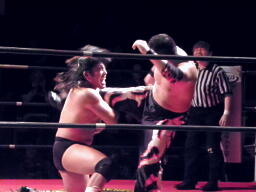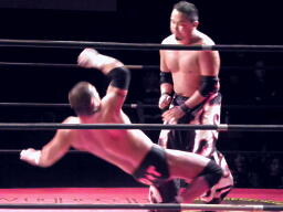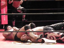 佐々木バック取る、東郷スタンディングのアームロックに切り返す(左写真)、佐々木コーナーに押し込んで竹田にタッチ。