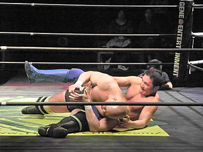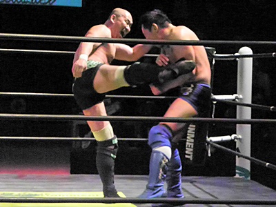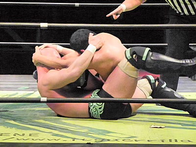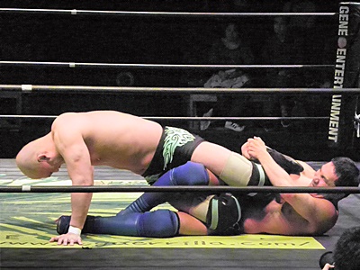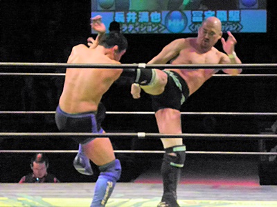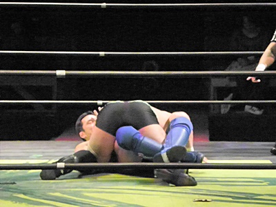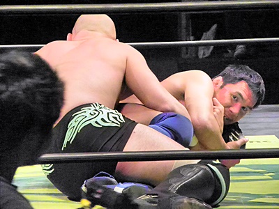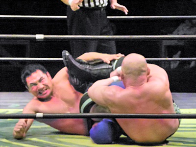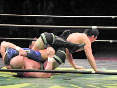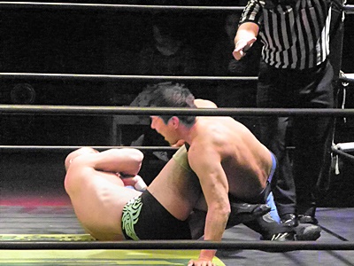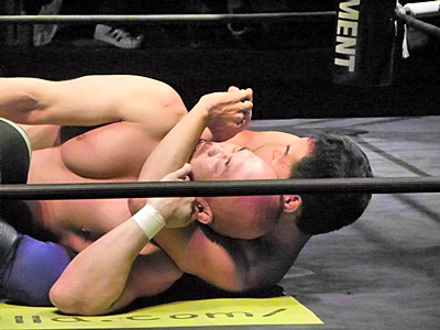 冨宅アキレス腱固め(右写真)、長井アンクルホールド、両者転がってロープブレーク。