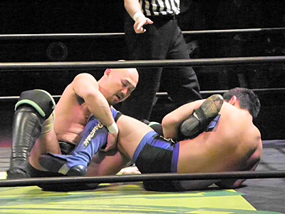 冨宅ヒザを固めつつもう片足にアンクルホールド(左写真)、長井ロープ。長井ロストポイント2。10分経過。