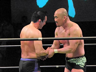 握手して言葉を交わす2人(左写真)。これぞ懐かしのUWFの世界。毎試合やってたらいろいろ無理も出そうだが、たまには見たい。