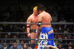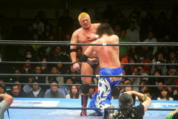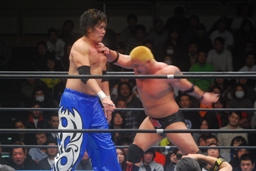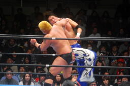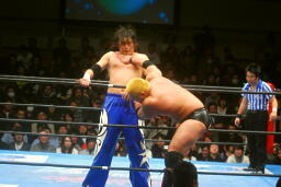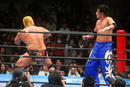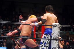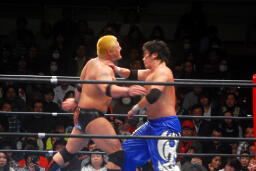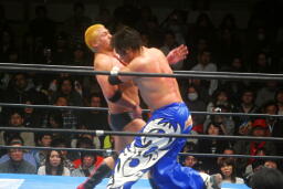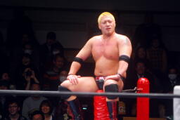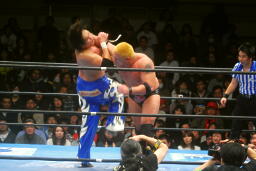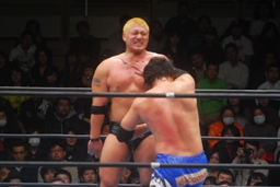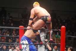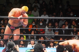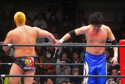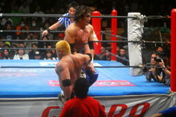 火野逆水平チョップ(左写真)、チョップ打ち込みながらカバー、カウント3。