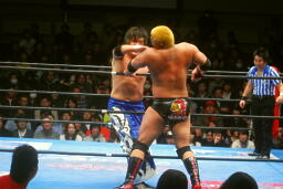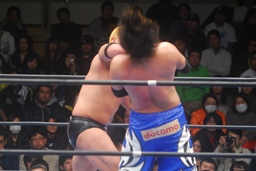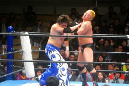 エプロンからダイブするが火野がチョップで迎え撃つ(右写真)。10分経過。