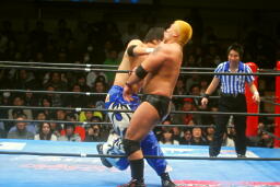 滝澤雪崩式ブレーンバスター(右写真)、ダブルノックダウン。両者カウント8で立つ。