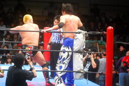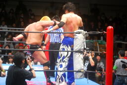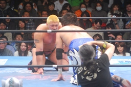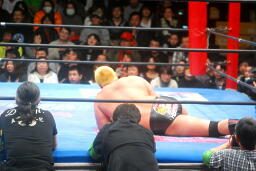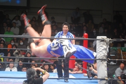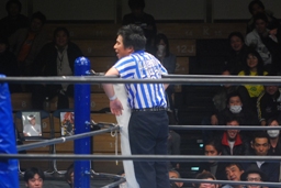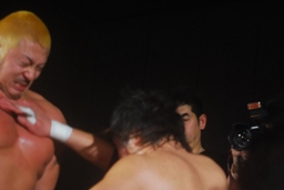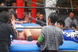 この時点からトミー茨城レフェリーが場外カウント開始(右写真)。場外カウントなしルールじゃなかったのか!ファンタジーイリュージョンでの最悪同盟の試合みたいにゆるい試合ならどうでもいいけど、選手権だからちょっと気になった。リングアウト裁定はありえないだけに。
