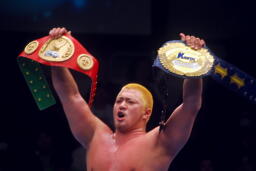 守りきった2本のベルトを掲げる火野(左写真)。凄い試合だった。