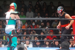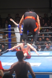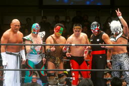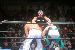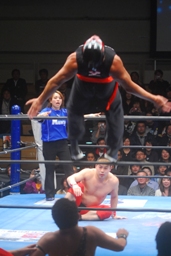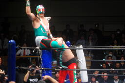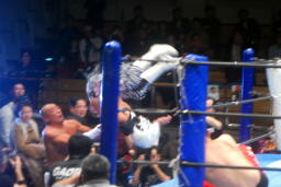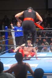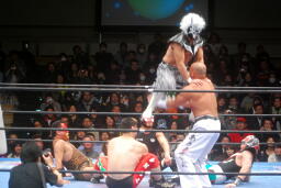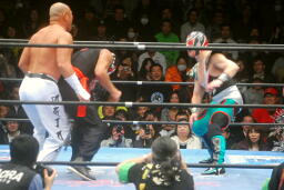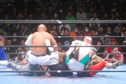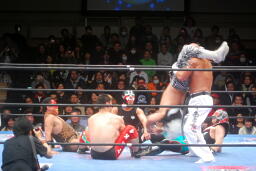 デルフィンとヨネがサスケとTAKAにヘッドロック、しかしリングの中央で同士討ちさせられる(左写真)、両者ダウン。