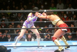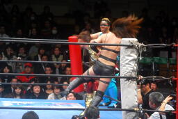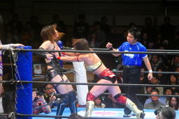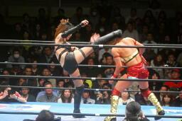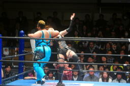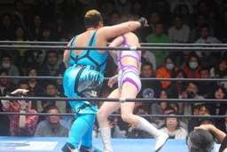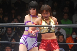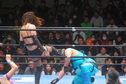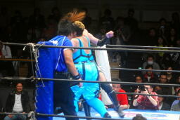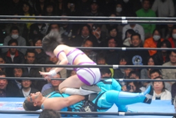山縣ロープに振ってヒップトス、真琴ブロック。真琴ロープに飛ぶ、山縣カウンターのチョップ(右写真)、カウント2。