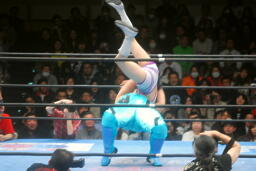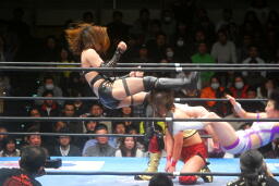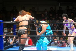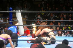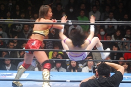 真琴側転式ダブルニードロップ(右写真)、カウント2。バンビにタッチ。