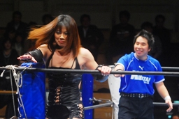バンビ勇躍リングインするが相手もアジャに代わったのを見てコーナーに戻る。しかし真琴はそこにはおらず(右写真)。