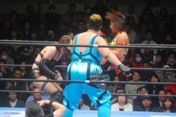 ダブルのキックからダブルのブレーンバスター狙うがアジャブロックして2人を投げる(左写真)。さらに2人にラリアット。