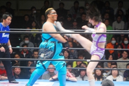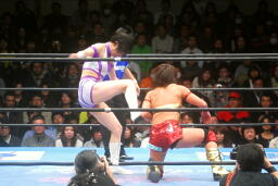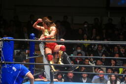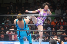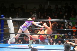 エルボーの打ち合い、真琴ロープに飛ぶ、山縣カウンターのドロップキック(右写真)、アジャにタッチ。