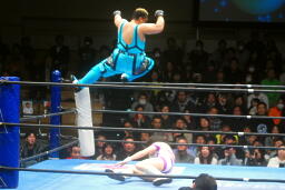 山縣入って串刺しエルボー(左写真)、コーナーに上ってミサイルキック、カウント2。