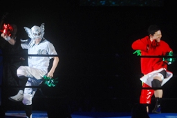 トマトとマリーンズが最初に入場、2人でトマトダンス(右写真)。