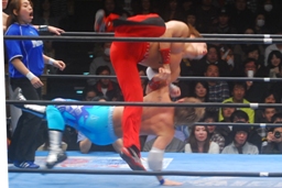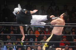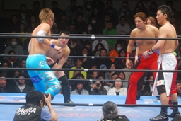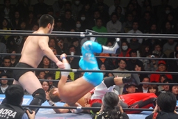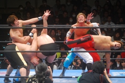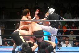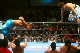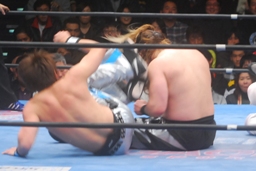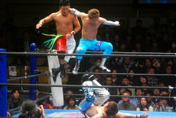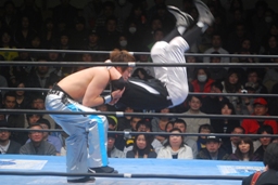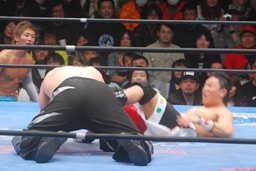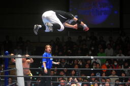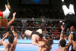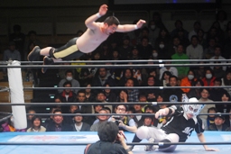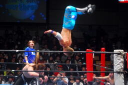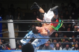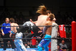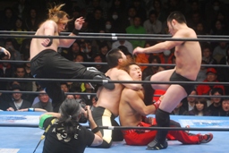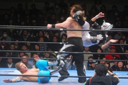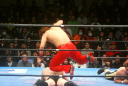 柏ヘッドバット、トウナイがトップロープを飛び越えてニードロップ(左写真)、マリーンズがカット。