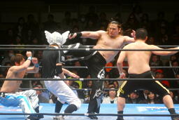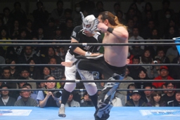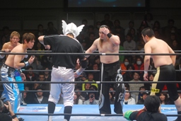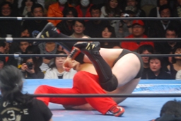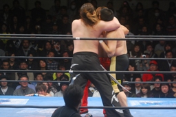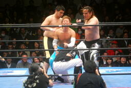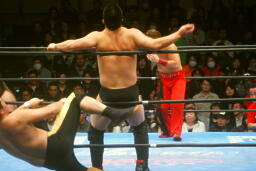 さらに関根も卍固めに決めた旭をマリーンズがカットしようとするが大石が捕まえる(右写真)。