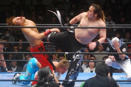 大石張り手からスタナー(左写真)、