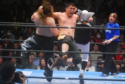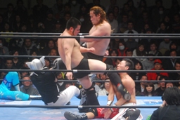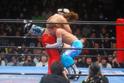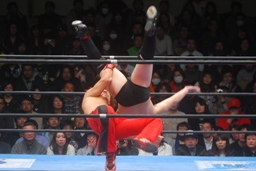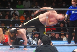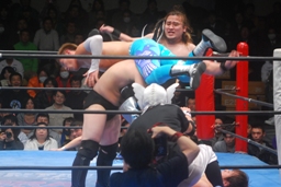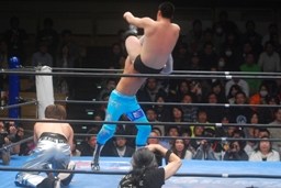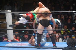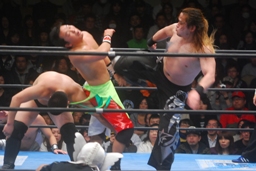 マリトマが関根&真霜にダブルのドロップキック、大石にマリトマバスター(右写真)、旭がカット。