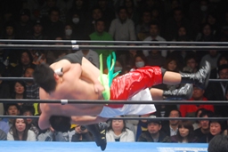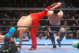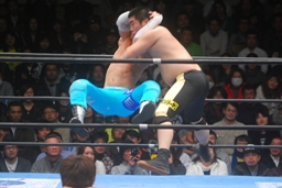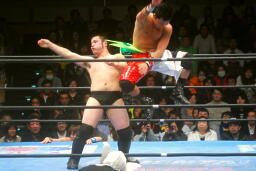 大石がトウナイをホールドして旭が延髄蹴り(右写真)。