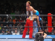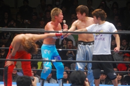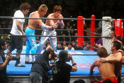 大石がこの試合の勝者に与えられる「この指とまれ」を実行すると、この試合に関係のない佐藤悠己が飛び込んでくる(右写真)。まこしおとまどいながらも一応OK。