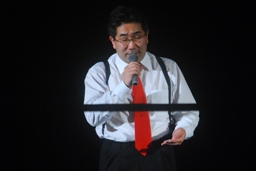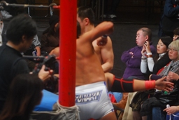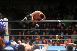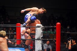 沼二郎ボディスラム、もう一発コーナーからのギロチンドロップ狙うが足を滑らせトップロープ飛び越えてのギロチンドロップにスイッチ(左写真)、カウント2。