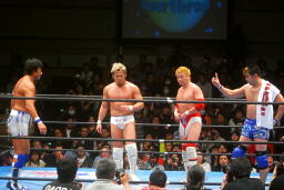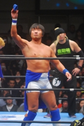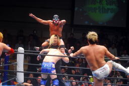 湯浅ロープに振る、カズはハンドスプリングオーバーヘッドキック(左写真)、湯浅立ち上がってラリアット、藤田とテイオーにタッチ。