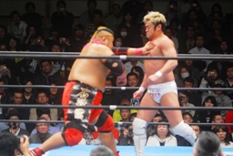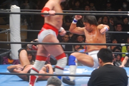 FUNAKIがフルネルソン、TAKAがドロップキック(左写真)、FUNAKIカバー、カウント2。