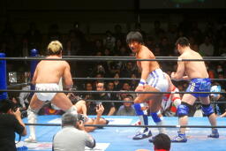 TAKAとカズはダブルのブレーンバスター狙うが藤田が阻止。TAKAとカズは藤田をダブルでロープに振るが藤田は2人にキック(右写真)。