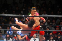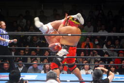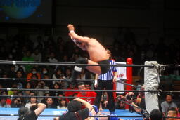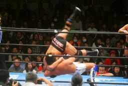 ダイビングヒップアタック(右写真)、カウント2。