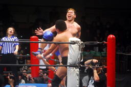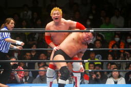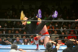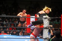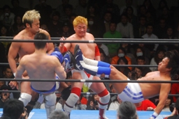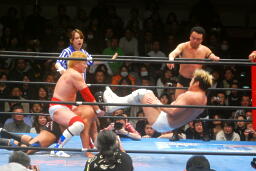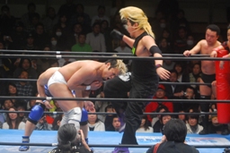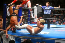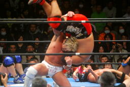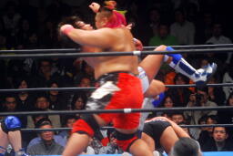 カズが湯浅を飛行機投げ(左写真)、藤田がカズにダイアモンドカッター。