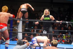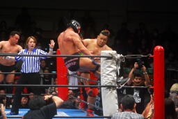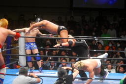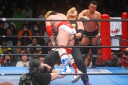 サスケとTAKAがリングイン、TAKAガットショット。カズ入りダブルでコーナーに振る、カズが串刺しニールキック、TAKAが串刺しニーアタック(右写真)。