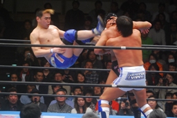 カズと湯浅が入りチョップの打ち合い(左写真)。