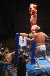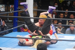 沼二郎入って来たTAKAにボディスラムからコーナーに上ってダイビングギロチンドロップ(左写真)、カウント2。