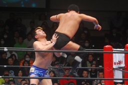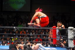 湯浅打ち勝ちボディスラムからコーナーに上ってダイビングエルボードロップ(右写真)、カウント2。