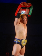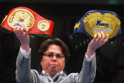 王者・火野がSTRONGEST-KとSTRONGEST-C(チョップNo.1)の2本のベルトを掲げてアピール(右写真)。